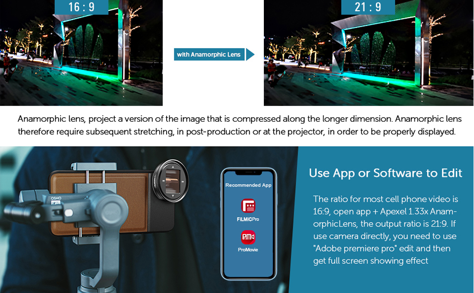 - 📷How it works?: The anamorphic lens brings the organic look and character of 2:40:1 with 1.33x design.it’s like shooting a wider focal length in the horizontal direction and a longer focal length in the vertical. It's suitable for hte recording of widescreen videos.Works with the Pro Camera App like(ProMovie,FILMIC PRO) to de-squeeze the image when shoot video and photos. or after shooting by phone+1.33x anamorphic lens,use Premiere Pro software to change the length of long and wide from 100
