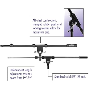 Professional 19"- 32" telescoping boom features standard 5/8"-27 threads, a positioning washer, plastic end caps and stamped rubber pads which allows for maximum grip. Boom arms maximum rotation is 320 degrees to allow for full extensions and max flexibility when miking.